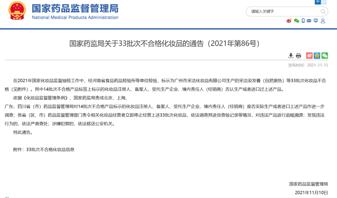 藥監(jiān)局發(fā)布33批次不合格化妝品通告涉及