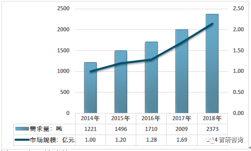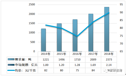 目前我國奧克立林市場參與企業(yè)數(shù)量較少,產(chǎn)業(yè)整體規(guī)模不大,2018年國內(nèi)奧克立林產(chǎn)品需求總量為2373噸,國內(nèi)市場規(guī)模從2014年的1.00億元增長至2018年的2.14億元。