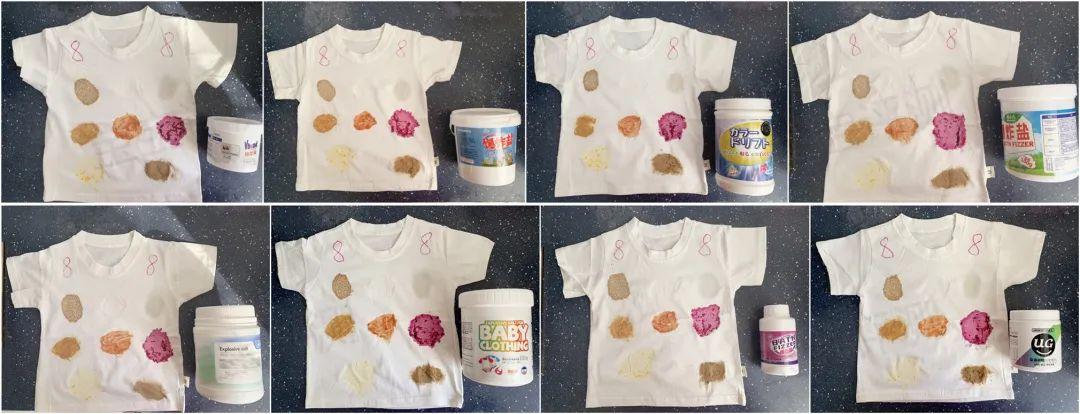 ②在相同的純棉白T上,等量均勻涂抹9種污漬,靜置12小時待污漬完全變干。