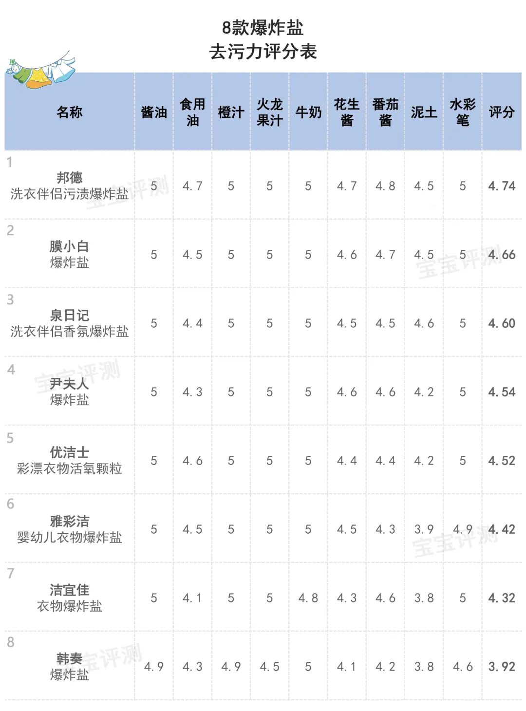 綜合以上分析,8款爆炸鹽笨爸爸給出的易漂洗性評分情況如下:
