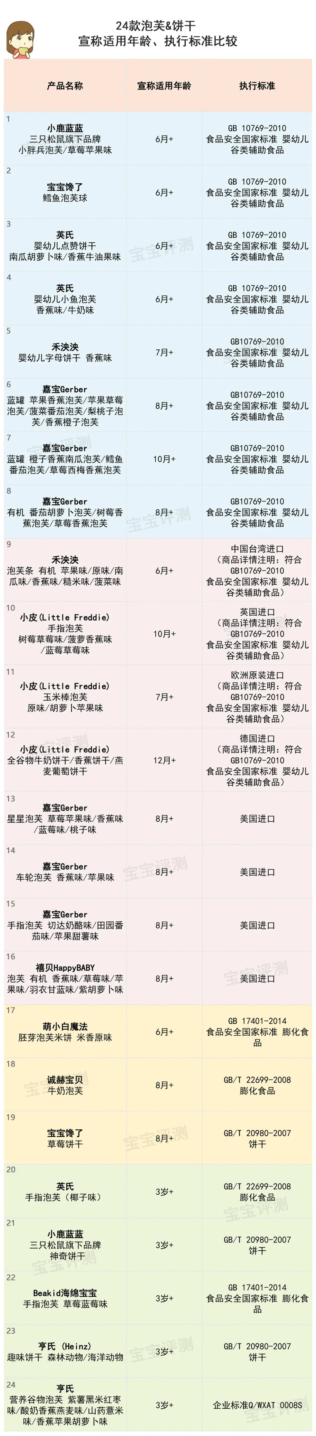 1、8款國(guó)產(chǎn)泡芙、餅干產(chǎn)品適用0~3歲嬰幼兒,執(zhí)行的是標(biāo)準(zhǔn)GB 10769-2010 《食品標(biāo)準(zhǔn) 嬰幼兒谷類輔助食品》。