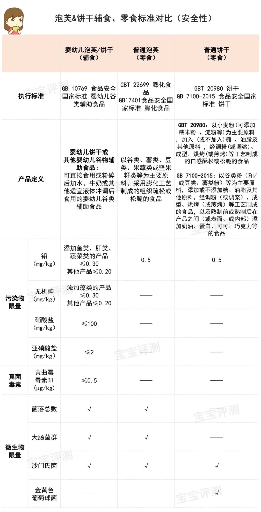 執(zhí)行輔食標(biāo)準(zhǔn)的泡芙和餅干,要求會(huì)更加嚴(yán)格。對(duì)鉛、無機(jī)砷、硝酸鹽、亞硝酸鹽、黃曲霉毒素B1等指標(biāo)有更嚴(yán)格的限量要求,而且對(duì)維生素B1、鈣這兩個(gè)營(yíng)養(yǎng)成分有低含量要求。