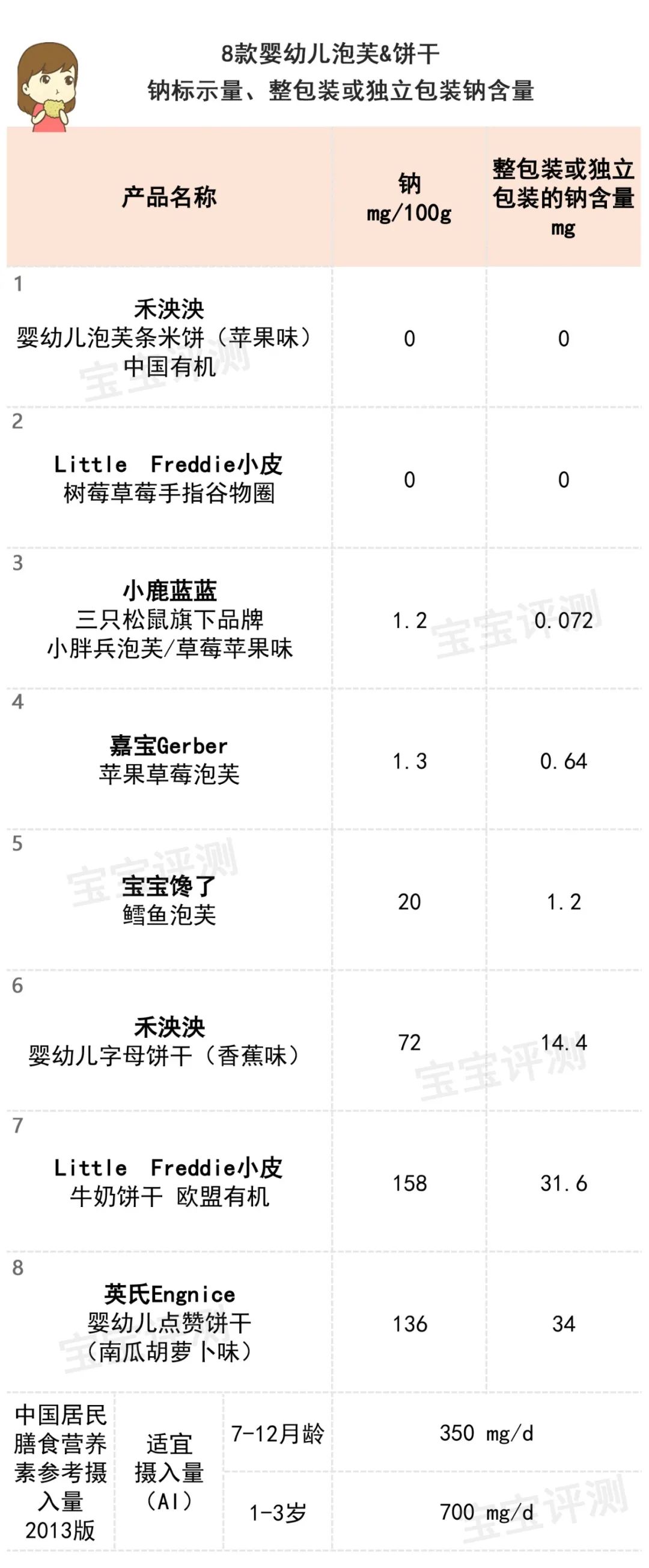 根據(jù)GB 28050-2011《預(yù)包裝食品營(yíng)養(yǎng)標(biāo)簽通則》,含鈉≤120mg/100g (固體)或100ml (液體)為低鈉食品。除了小皮、英氏兩款餅干,其它6款泡芙或餅干均屬于低鈉食品。