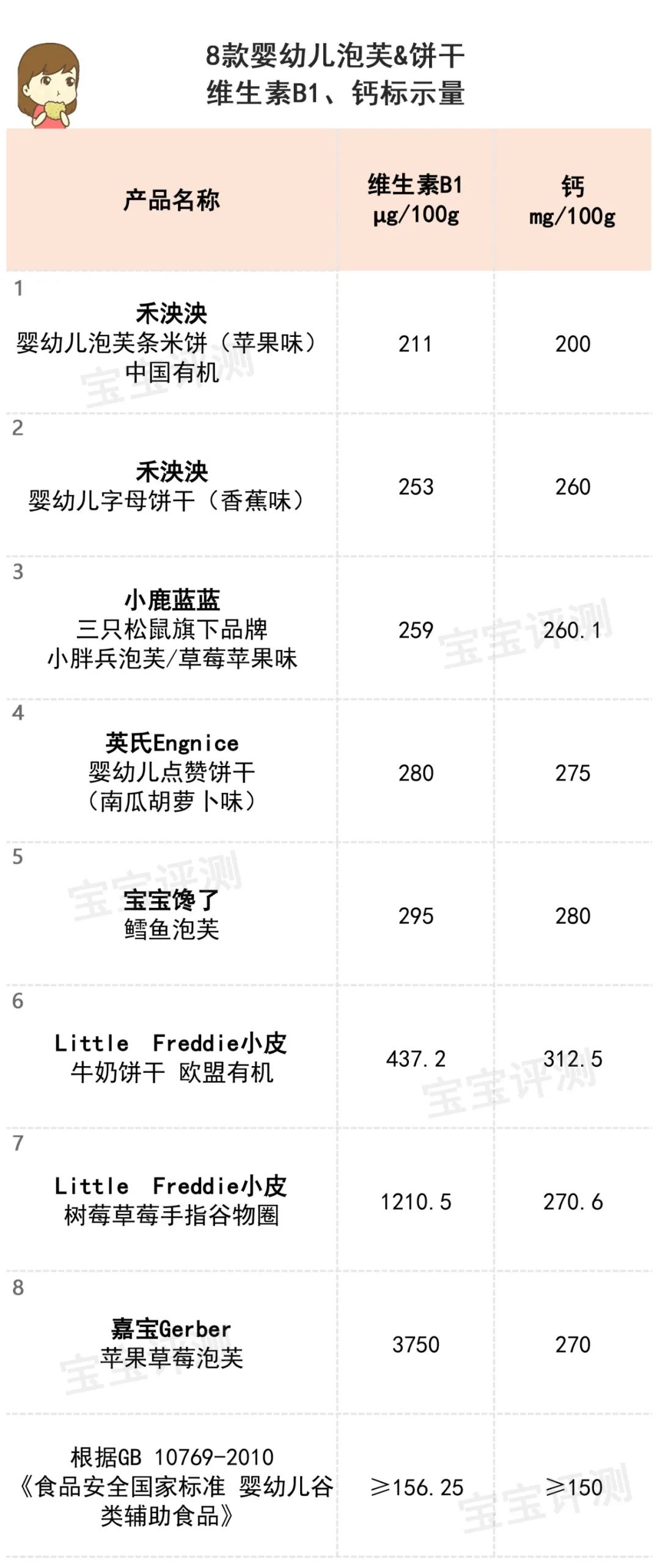 8款產(chǎn)品均達(dá)到國(guó)標(biāo)要求的低維生素B1和鈣含量。其中,小皮和嘉寶泡芙的含量更高一些。