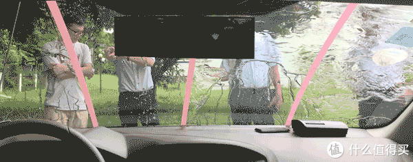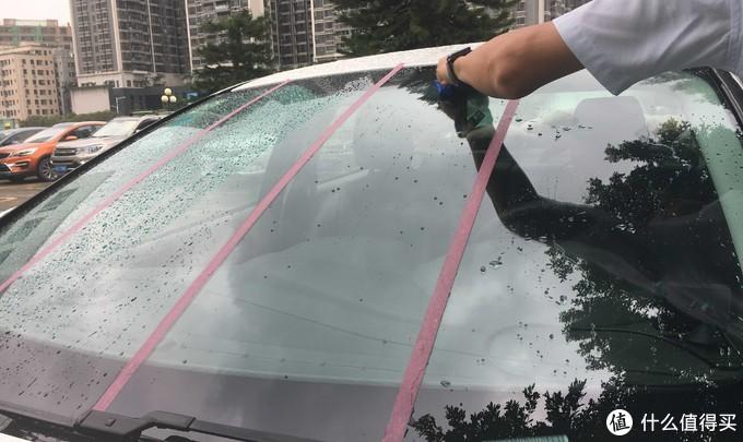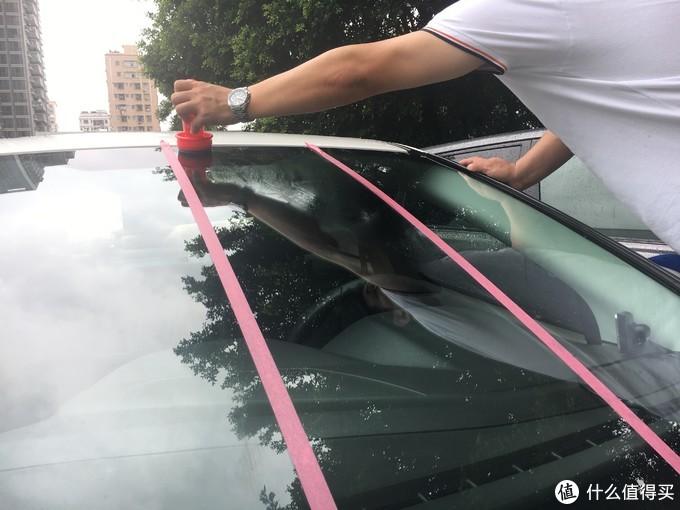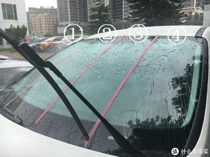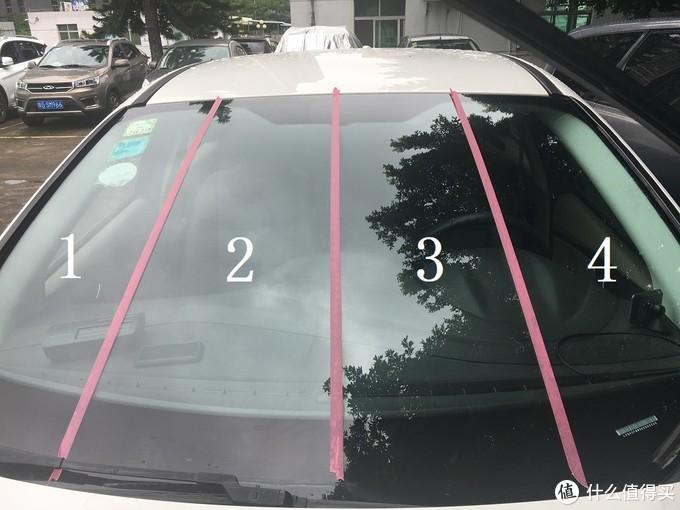 為了比對果,我模仿了一下網(wǎng)友的做法,用紅膠紙把前擋玻璃分成4個板塊,然后分別進(jìn)行施工、試驗(yàn)