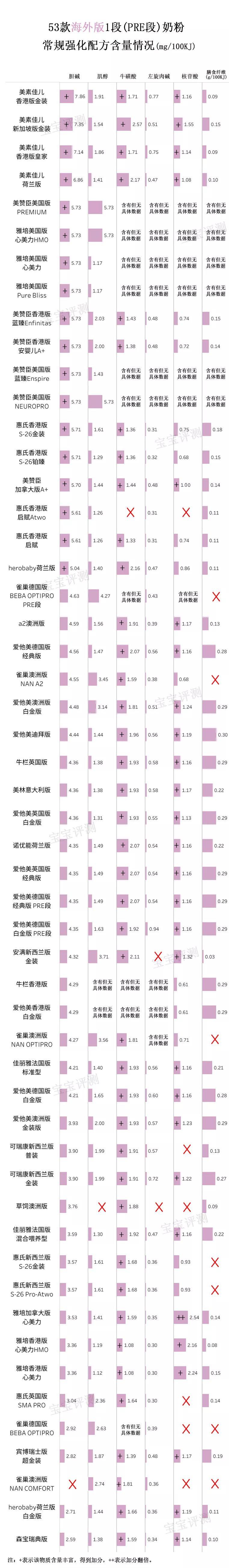 ③18款奶粉的膽堿含量較多、42款奶粉的?;撬?/strong>含量較多,28款奶粉的核苷酸含量較多,得到額外加分(標(biāo)注為+)。