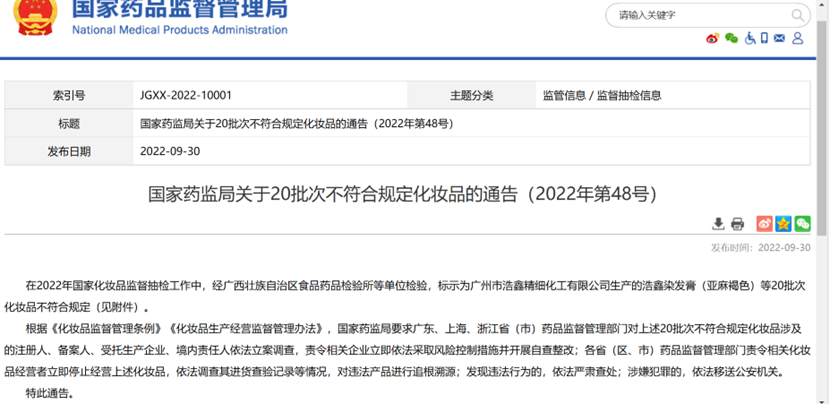無(wú)獨(dú)有偶,今年9月30日,藥監(jiān)局關(guān)于20批次不符合規(guī)定化妝品的通告中,也有資生堂的安熱沙水能戶外清透防曬乳。