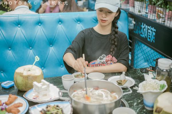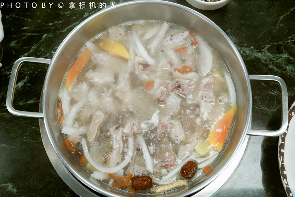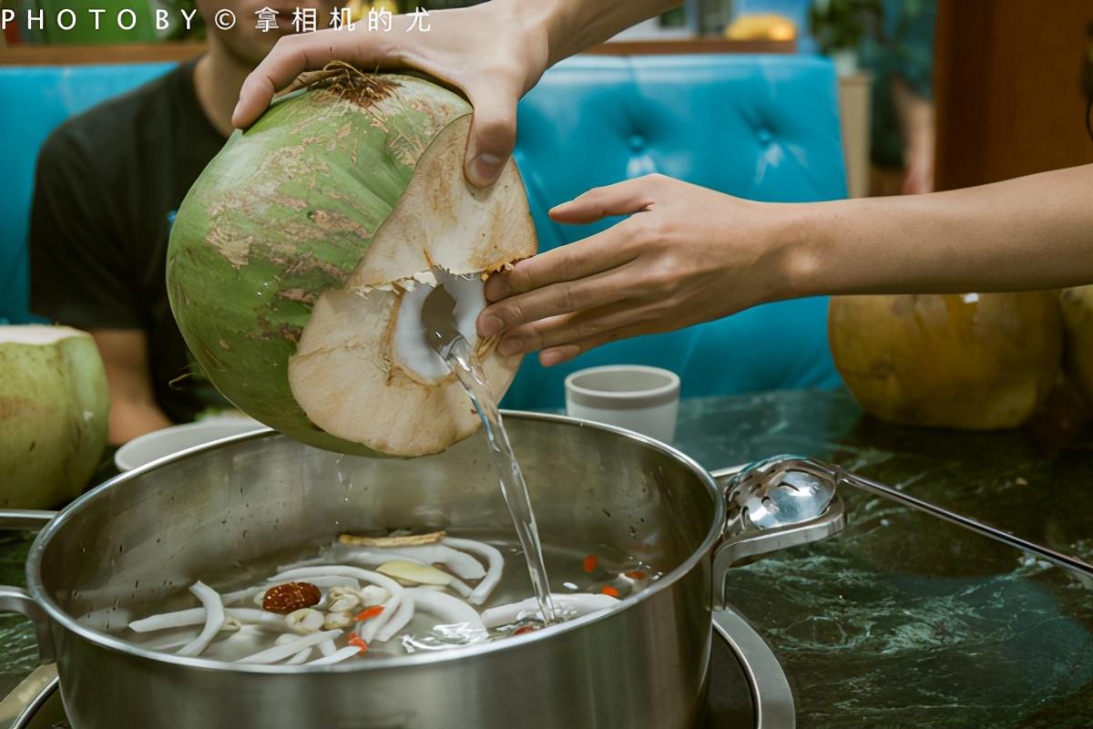 ??我們點(diǎn)的花膠木瓜椰子雞,膠原滿滿地,養(yǎng)顏美容,湯汁更美味。三個(gè)椰子一只文昌雞,和椰肉、花膠、木瓜,珍珠馬蹄、枸杞、紅棗、五指山毛桃等珍貴食材一起煮。喝的是食材本身熬制的湯汁。先喝湯,再吃肉。
