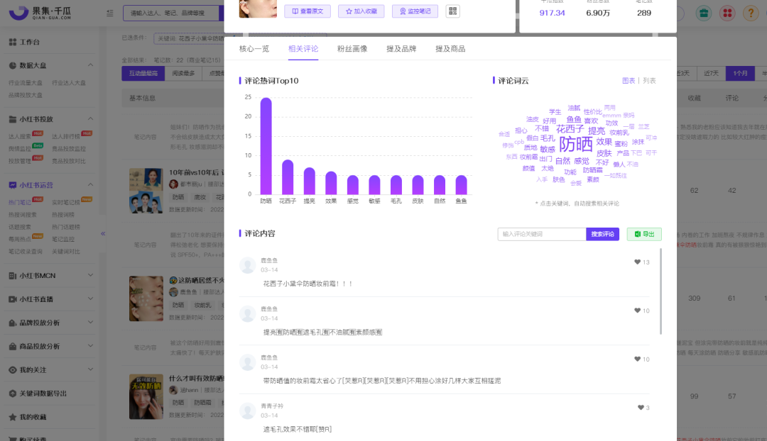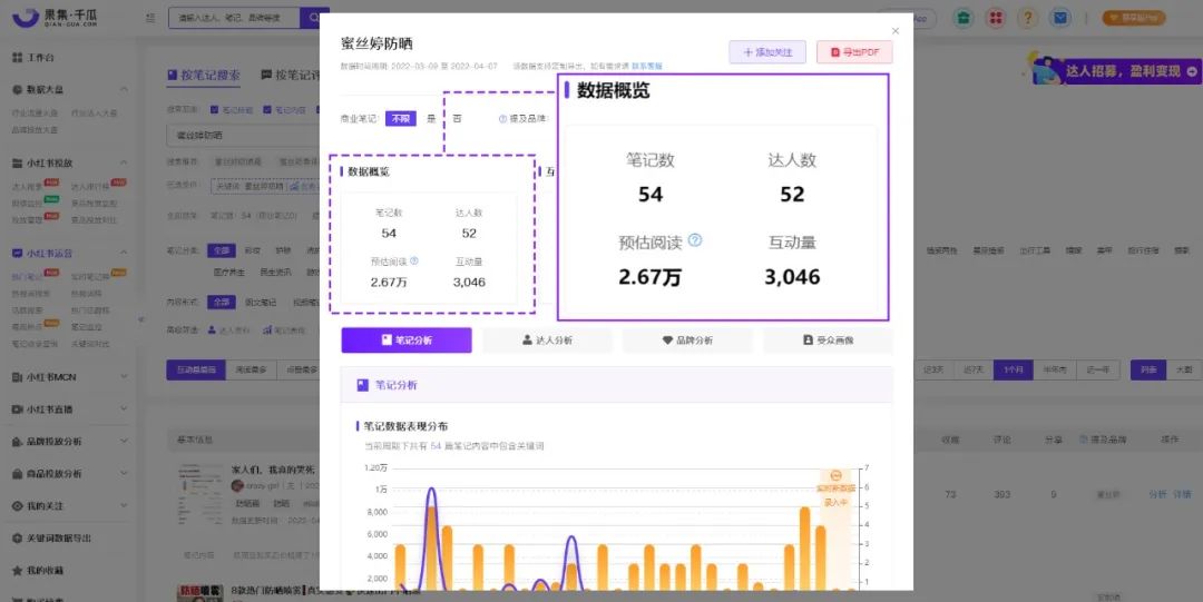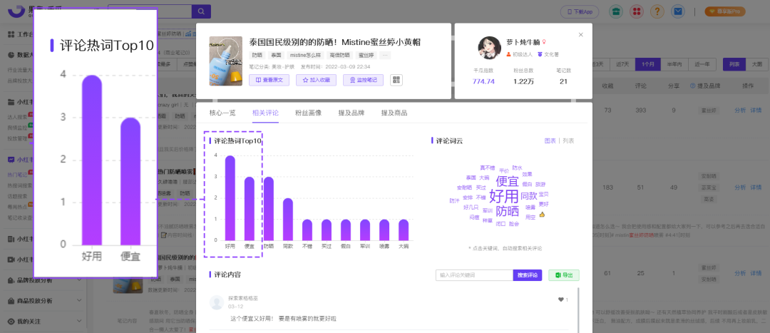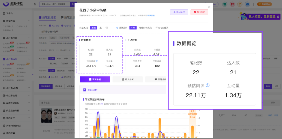 據(jù)果集·千瓜數(shù)據(jù)-熱門筆記顯示,“花西子小黛傘防曬”相關(guān)筆記超過200篇,近30天(2022.3.7-4.6)種草筆記數(shù)20篇,其中商業(yè)筆記就有15篇,互動量超過1.34萬,在3月份的防曬賽道中鋪開了產(chǎn)品聲量。