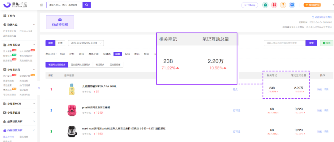 此外,防曬產(chǎn)品已經(jīng)深耕更多細(xì)分領(lǐng)域,入局母嬰人群,深受消費者喜愛。在小紅書上搜索“嬰兒防曬”有20萬+篇筆記,果集·千瓜數(shù)據(jù)商品種草榜顯示,小紅書嬰兒防曬的“碧柔兒童防曬乳”3月筆記數(shù)量為572篇,筆記互動總量為6.69萬,種草更多消費人群。