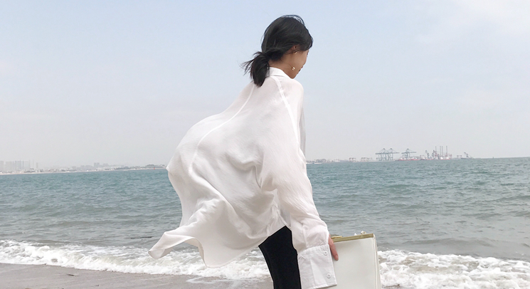 它是介于絲和紗之間的清爽的料子。印花調(diào)整了很久才達(dá)到這種若隱若現(xiàn)的果,抽象中國山水畫,線條間不那么分明,有一種朦朧美。領(lǐng)口袖口下擺羅紋收口,黑色細(xì)線條清晰流暢。這個顏色版型用料都決定了它既百搭,又很別致吶。