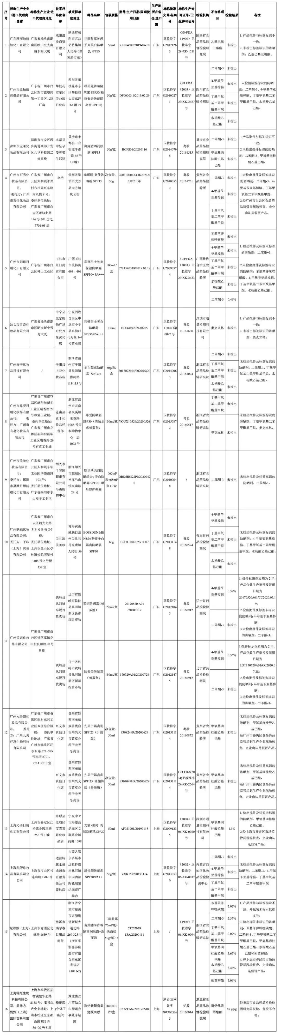 其中,經(jīng)生產(chǎn)企業(yè)所在地食品藥品監(jiān)管部門現(xiàn)場核查,并經(jīng)生產(chǎn)企業(yè)確認,標(biāo)示為廣州市可秀化妝品有限公司(委托方:廣州市萊仕化妝品有限公司)生產(chǎn)的瑞雨麗·萊仕防曬霜SPF35,廣州元美盛化妝品有限公司(委托方:廣州九美仟惠生物科技有限公司)生產(chǎn)的九美子隔離乳SPF25(升級版)和九美子隔離乳SPF25修顏飾底(升級版),上海沁語日用化工有限公司生產(chǎn)的艾霏·萊婷秀緣防曬乳SPF30,妮維雅(上海)有限公司生產(chǎn)的妮維雅?防曬隔離潤膚露+洗面奶等相關(guān)批次產(chǎn)品為假冒產(chǎn)品。