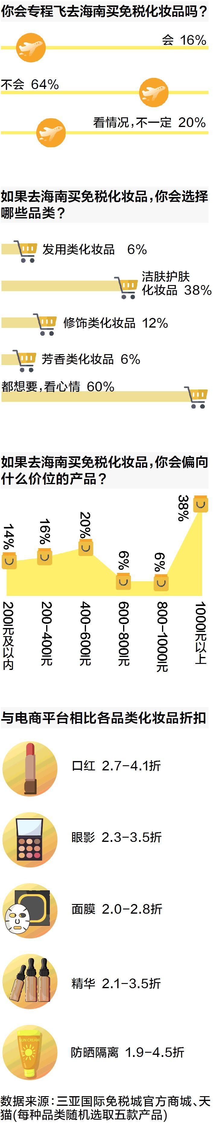 調(diào)查結(jié)果顯示,有64%的受訪(fǎng)者們表示不會(huì)專(zhuān)程飛去海南買(mǎi)免稅化妝品,而僅有16%的受訪(fǎng)者們?cè)敢鈱?zhuān)程赴瓊購(gòu)物,剩余兩成受訪(fǎng)者們則對(duì)此持保留態(tài)度,稱(chēng)“看情況,不一定”。