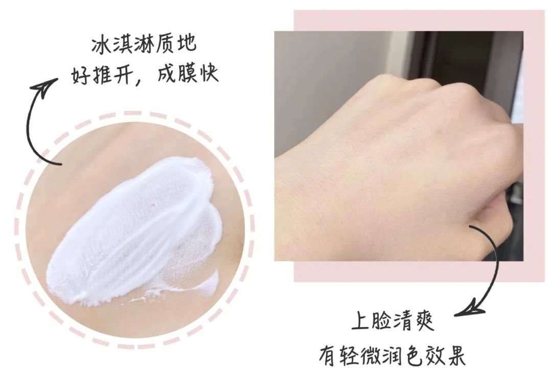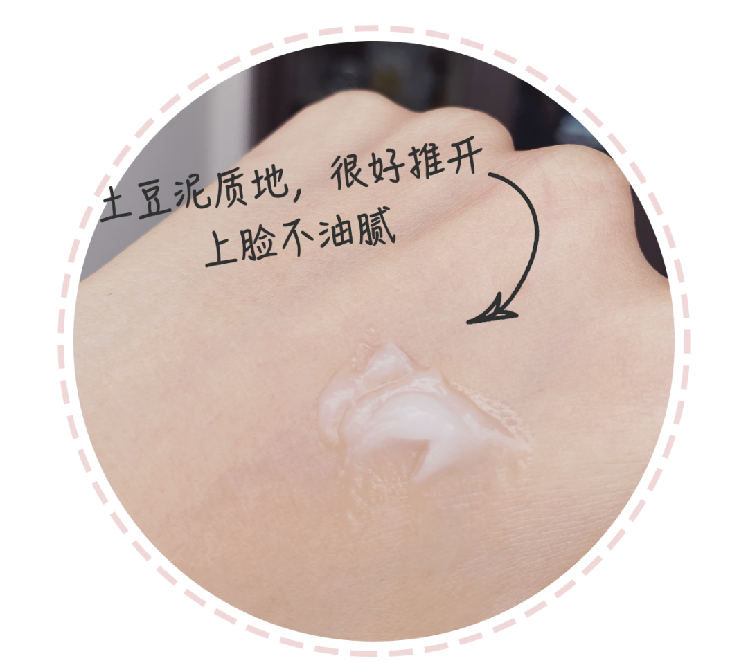 它的質(zhì)地像冰淇淋,輕薄好推開,成膜快。因?yàn)闆]有添加植物油、礦物油等,膚感比較水潤清爽,這點(diǎn)我是真的愛了,更適合混合皮和油皮,敏感肌痘痘肌也可以使用。