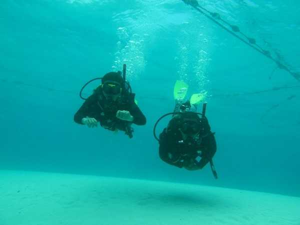 學習完裝備之后,下水,教練在淺灘教授水中技巧,除了學習下潛、上浮,水下游動和面鏡排水等這些基本的技能,教練重點教授了遇到意外危險時救命的技巧,比如二級頭排水,CESA,二級頭尋回,共用氣源呼吸,水下面鏡穿脫,水面穿脫BCD,水下穿脫BCD,緊急拋棄配重等等。
