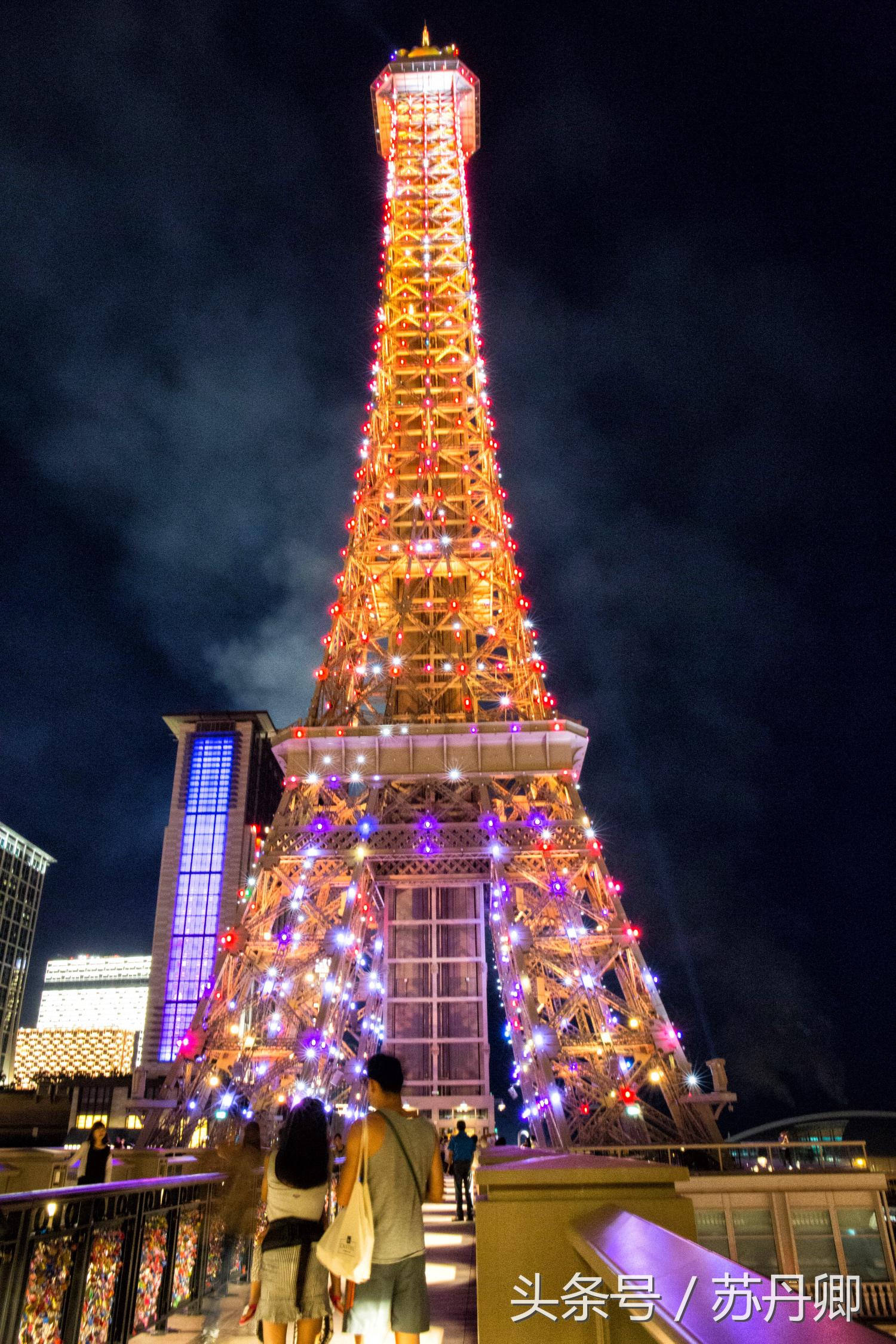 逛完氹仔,可以返回酒店休息,然后從酒店里面前往澳門巴黎人,在巴黎人酒店五樓的鐵塔紀念店邊上進入,然后賣票登塔。該塔高可以站在37層,基本上將周邊酒店景點一覽無遺,而且落日之后,華燈初上,美妙的音樂突然回響耳畔,如此浪漫之夜,的遺憾就是為什么我是一個人來呢?鐵塔門票:成人100,小孩80。在塔上時間逗留自定。
