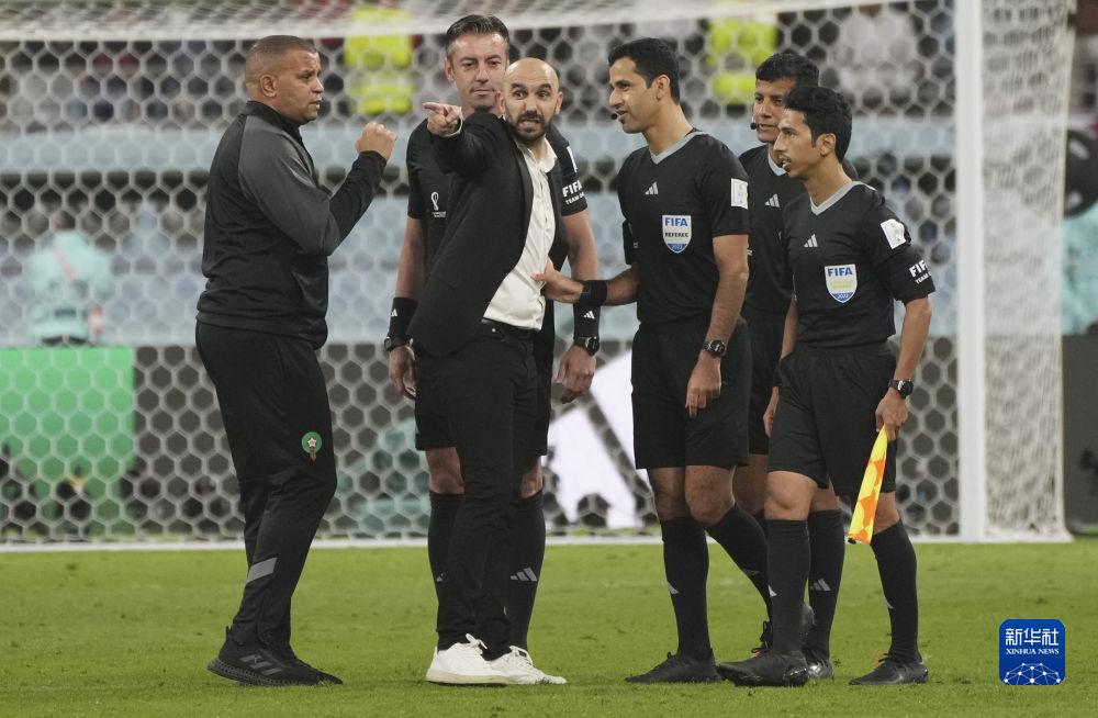 12月17日,摩洛哥隊(duì)主教練瓦利德·雷格拉吉(左三)在比賽后與主裁判阿爾·賈西姆(右三)交流。新華社記者 孟永民 攝