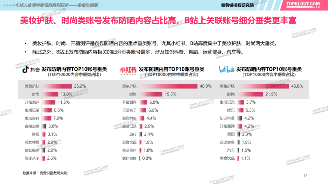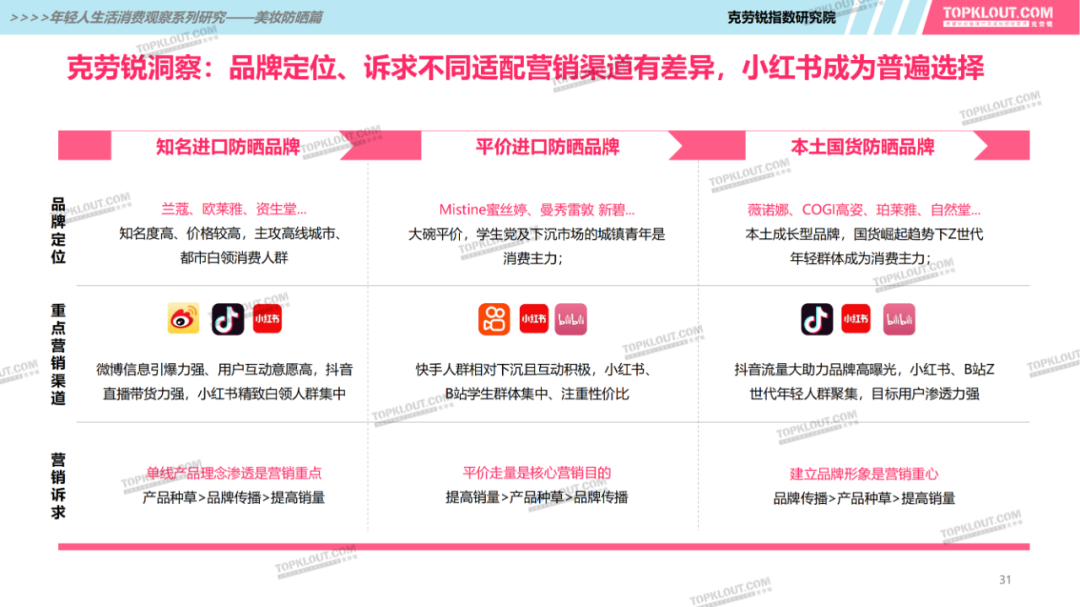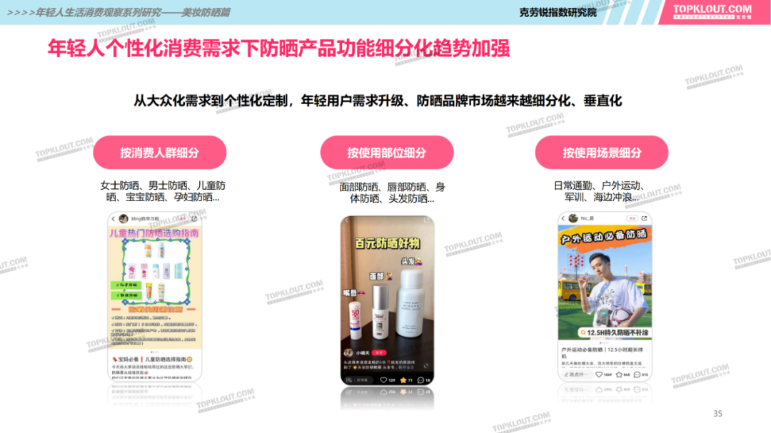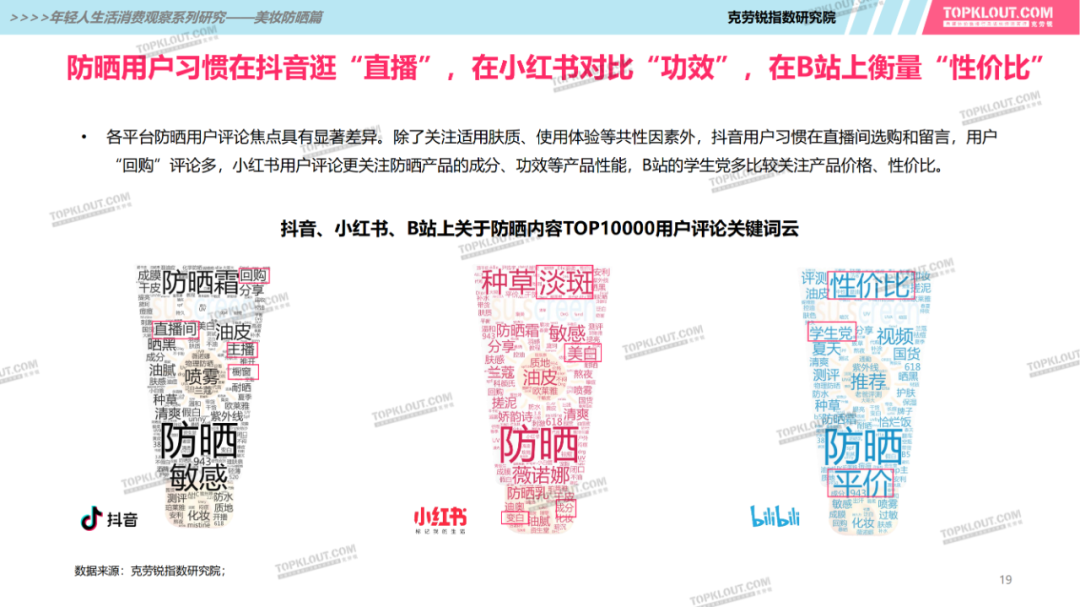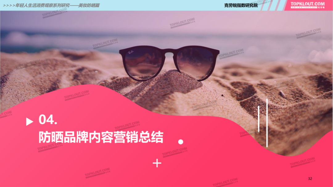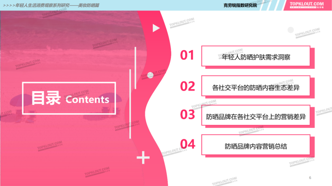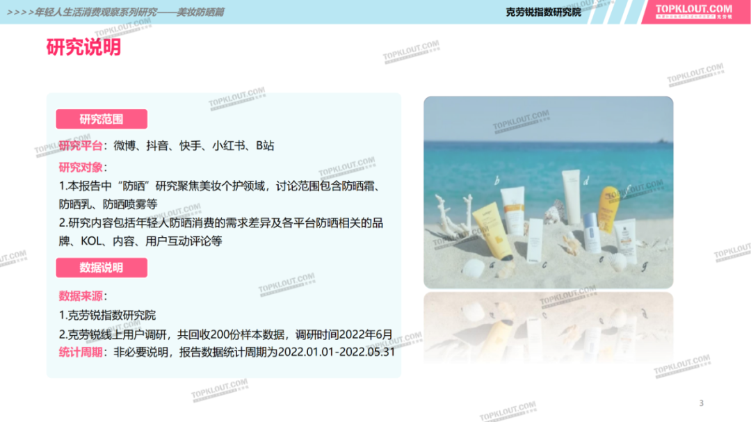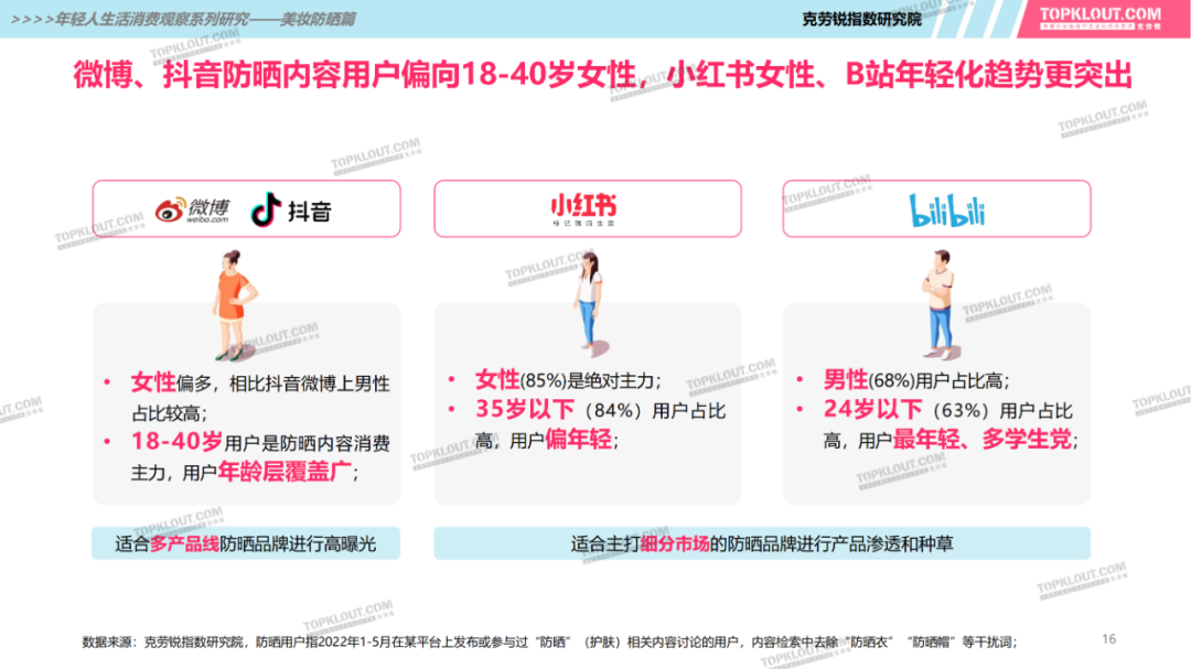 年輕人對(duì)防曬護(hù)膚品的需求特征是什么?不同平臺(tái)上受年輕人歡迎的防曬品牌有哪些?如何做營(yíng)銷(xiāo)?防曬品牌在各平臺(tái)的營(yíng)銷(xiāo)差異有哪些?怎樣做社交內(nèi)容營(yíng)銷(xiāo)更易吸引年輕人的注意力?透過(guò)不同防曬品牌的內(nèi)容營(yíng)銷(xiāo)看到了哪些營(yíng)銷(xiāo)新機(jī)會(huì)?報(bào)告中“防曬”研究聚焦美妝個(gè)護(hù)領(lǐng)域,討論范圍包含防曬霜、防曬乳、防曬噴霧等。研究?jī)?nèi)容包括年輕人防曬消費(fèi)的需求差異及各平臺(tái)防曬相關(guān)的品牌、KOL、內(nèi)容、用戶(hù)互動(dòng)評(píng)論等。
