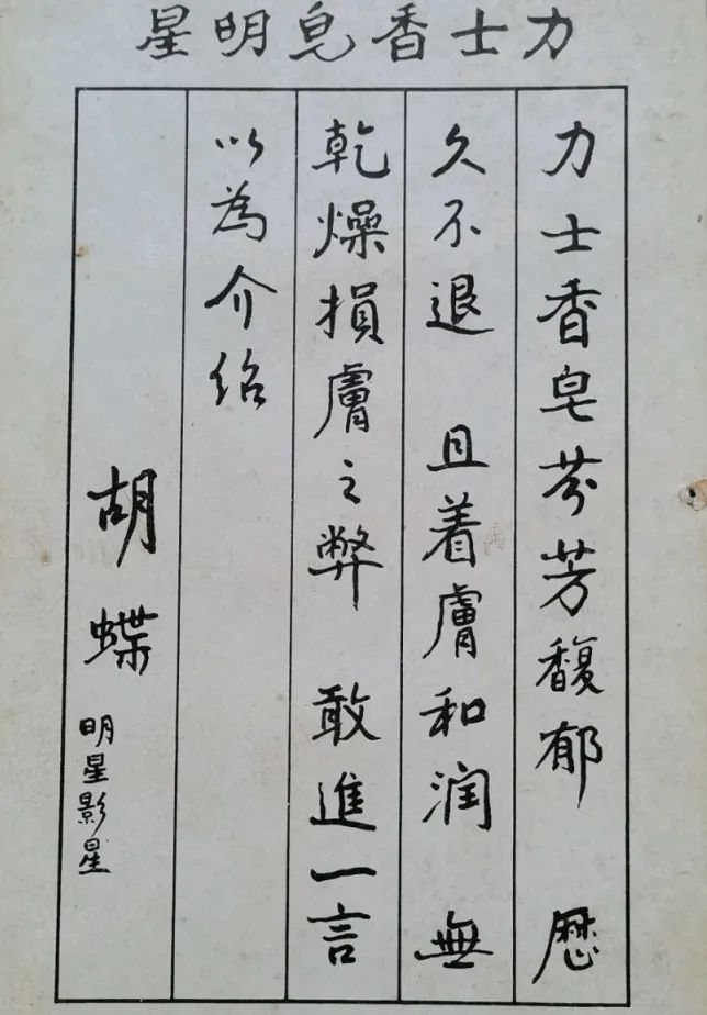 這件事之后,胡蝶就成為商家爭搶的大明星:力士、先施等都請她拍過廣告。其中,力士香皂的廣告詞寫得尤為有趣,從明星的親身體驗分享出發(fā),夸贊了香皂的氣味芬芳、留香時間長,特別強調它的細膩滋潤,不會令皮膚干燥……和我們現在對清潔品的需求,別無二致。