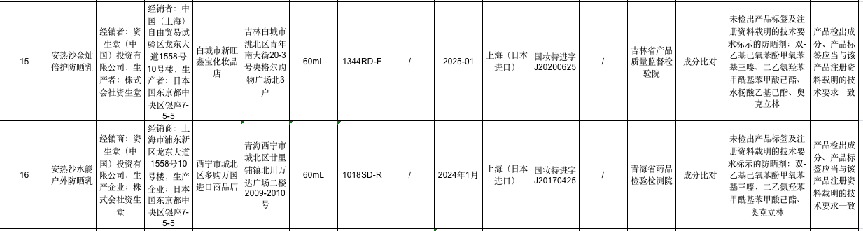 通告顯示,產(chǎn)品標(biāo)簽標(biāo)示為株式會(huì)社資生堂生產(chǎn)、資生堂(中國(guó))投資有限公司經(jīng)銷(xiāo)的“安熱沙金燦倍護(hù)防曬乳”經(jīng)吉林省產(chǎn)品質(zhì)量監(jiān)督檢驗(yàn)院檢驗(yàn),成分比對(duì)不符合規(guī)定,未檢出產(chǎn)品標(biāo)簽及注冊(cè)資料載明的技術(shù)要求標(biāo)示的防曬劑:雙-乙基已氧苯酚甲氧苯基三嗪、二乙氨羥苯甲?;郊姿峒乎?、水楊酸乙基己酯、奧克立林。
