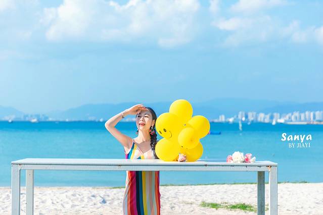 帶了黃色的氣球來當(dāng)?shù)谰?,海灘可以拍到鳳凰島當(dāng)背景的海,角度還是很美的。這里有很多拍婚紗的機構(gòu),沙灘上好多對情侶在拍照。