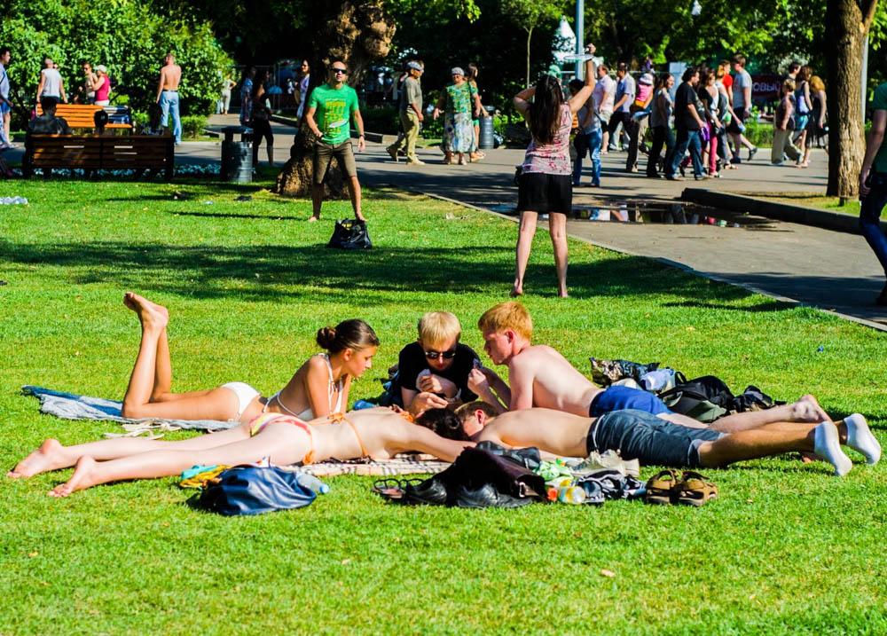 有錢人出國(guó)曬、海島曬,沒錢人河邊曬、草地曬,甚至廣場(chǎng)曬、陽臺(tái)曬。曬太陽是俄羅斯人愛的休閑方式,沒有之一!