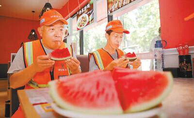 石家莊市橋西區(qū),環(huán)衛(wèi)職工正在“愛心驛站”里吃西瓜解暑。張文靜攝(影像中國)