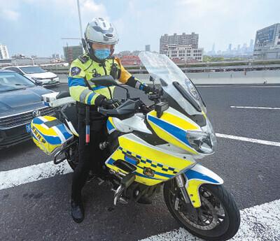 南京市交管局鐵騎中隊(duì)隊(duì)員陳麟麟剛從固定崗位換班,準(zhǔn)備騎著摩托車去巡邏。本報(bào)記者 姚雪青攝