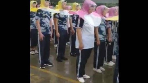 學(xué)校為了避免下雨耽誤學(xué)生軍訓(xùn),為同學(xué)們準(zhǔn)備了這頂特別的“雨帽”,學(xué)生們看起來像一朵朵蘑菇一樣,冒著雨在操場上站軍姿,看著同學(xué)們一個個艱苦訓(xùn)練的樣子,甚至有網(wǎng)友開玩笑稱,雨:我救不了你們。
