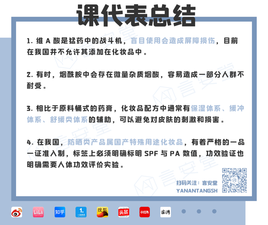 藥劑類(lèi)品更多的是體現(xiàn)核心原料的作用。上述配方防腐體系、PH調(diào)節(jié)劑等溫和度欠佳,敏感肌的小伙伴注意。同時(shí)煙酰胺中會(huì)存在微量雜質(zhì)煙酸,也會(huì)造成一部分人群不耐受。