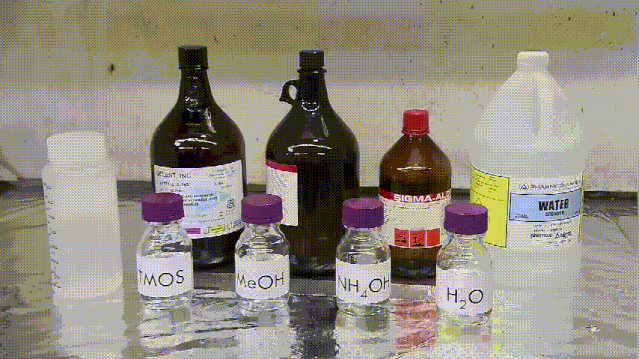 將一定量的硅酸甲脂和甲醇倒入底部含有攪拌珠的燒杯中,再將燒杯移到一臺能產(chǎn)生旋轉(zhuǎn)磁場的設(shè)備上,磁場能讓攪拌珠旋轉(zhuǎn)將燒杯中的兩種材料攪拌均勻,然后將這種混合物倒入裝有水,氫氧化銨和甲醇的更大燒杯中,此時一場化學(xué)反應(yīng)就將發(fā)生,這些混合物會形成凝膠。