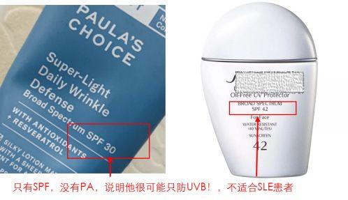 如果防曬霜同時印有SPF、PA,那么符合SLE患者的防曬要求。反之,如果僅印有SPA,那么很可能只能防止UVB,不符合SLE防曬要求,不建議購買。