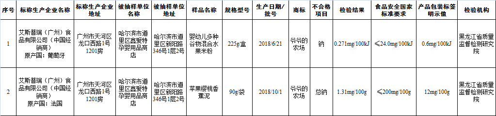 市場監(jiān)管總局2019年6月20日的通報顯示,在黑龍江市場的抽檢中,“爺爺?shù)霓r(nóng)場” 嬰幼兒多種谷物混合水果米粉(225g/盒,2018-6-21,原產(chǎn)國:葡萄牙)鈉指標(biāo)不達標(biāo)。
