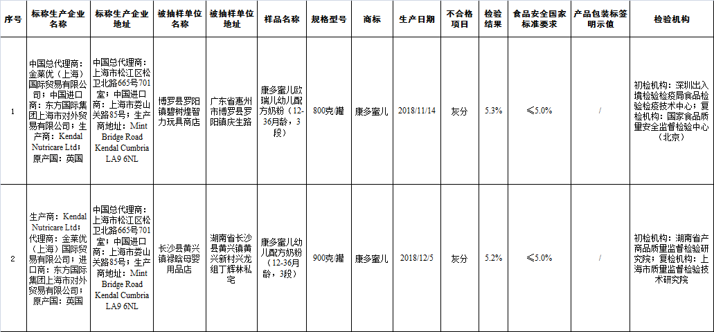 01奶粉:英國品牌“康多蜜兒”不合格根據(jù)市場監(jiān)管總局2019年8月27日的通報,廣東市場和湖南市場分別有一個批次的康多蜜兒3段奶粉被抽檢不合格。