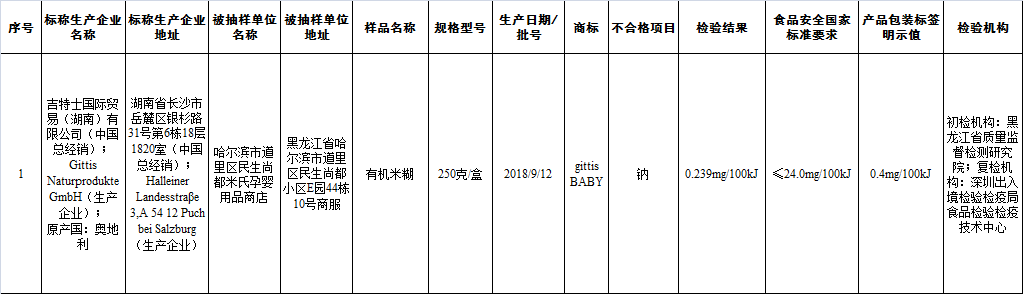 02米粉:吉特士、爺爺?shù)霓r(nóng)場不合格市場監(jiān)管總局2019年8月27日的通報顯示,在黑龍江市場的抽檢中,Gittis Naturprodukte GmbH生產(chǎn)的有機米糊(原產(chǎn)國:奧地利),鈉指標(biāo)不達標(biāo)。