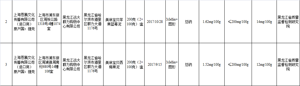 03果泥:美林、小皮、爺爺?shù)霓r(nóng)場不合格市場監(jiān)管總局2019年8月27日的通報顯示,在黑龍江市場的抽檢中,美林寶貝蘋果藍(lán)莓泥(原產(chǎn)國:捷克)、美林寶貝西梅果泥(原產(chǎn)國:捷克)各有一個批次產(chǎn)品總納指標(biāo)不合格。