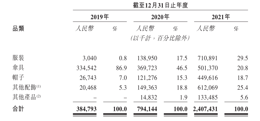 將新品研發(fā)的經(jīng)驗運用到其他品類,蕉下還陸續(xù)推出了漁夫帽、遮陽帽、袖套等爆款。其中帽子作為毛利率高的產(chǎn)品,其銷售收入在2021年達到4.5億元,占比為18.7%。而傘具的銷售收入為5.01億元,在總營收的占比下滑至20.8%。