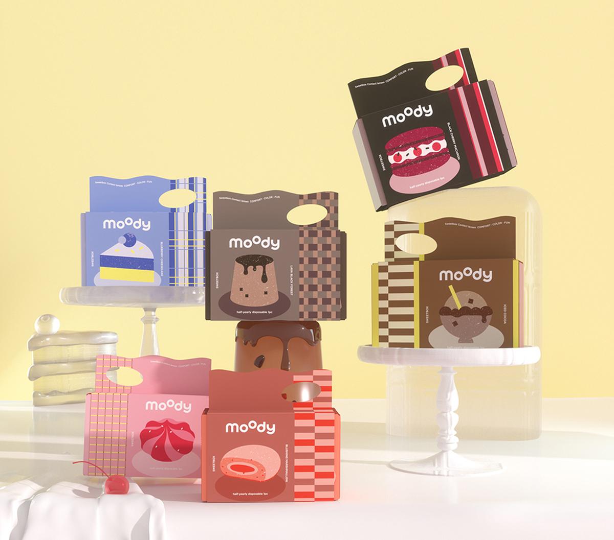 moody于本月初推出全新半年拋款美瞳——甜心販賣機,該系列以香甜軟糯的甜點為靈感打造。包裝盒上均影印著與美瞳配色相似的甜品圖案,甜美可愛。
