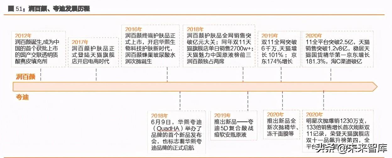 品牌知名度逐步擴大,線上銷售高速增長。潤百顏誕生于 2012 年,2016 年終端護膚品正 式上市,潤百顏蜂巢玻尿酸水潤次拋誕生,標志著華熙生物科技護膚新時代的開啟。2017 年 2 月,潤百顏護膚品正式登陸天貓旗艦店,一經銷售獲得廣泛市場好評,僅用約一年時 間就突破 1 億元銷售額大關。2018 年 12 年,故宮博物院與華熙生物聯(lián)名推出“故宮口紅”。 截至 2020 年,潤百顏始終保持高速增長,雙十一穩(wěn)居天貓國貨精華第一。2018 年 6 月, 夸迪品牌正式發(fā)布,以 5D 玻尿酸為核心陸續(xù)推出多個新品,2020 年雙十一明星次拋銷售 超 1230 萬支,實現 133 倍銷售增長刷新雙十一記錄。