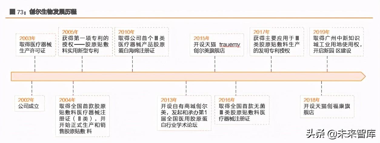 立足活性膠原開發(fā),借助電商拓寬經營領域,實現多元化布局。2002 年 8 月公司取得營 業(yè)執(zhí)照,創(chuàng)爾生物正式成立。之后在 2002 至 2006 年的早期創(chuàng)業(yè)階段,創(chuàng)爾生物逐步取得 醫(yī)療器械生產許可證、“膠原貼敷料”醫(yī)療器械注冊證、“膠原貼敷料”實用新型專利。此 期間,公司立足于活性膠原的研究開發(fā),逐步完成了工藝技術和早期客戶資源積累,為后 續(xù)持續(xù)發(fā)展奠定基礎。2007 年至 2011 年期間,公司繼續(xù)圍繞活性膠原進行產業(yè)化,豐富 醫(yī)療器械產品種類,開始著手膠原潤眼液、膠原蛋白凝膠、膠原蛋白海綿等產品的研究開 發(fā)。同時,公司加大力度布局生物護膚領域,將活性膠原應用到生物護膚品。2012 年至 2017 年期間,公司積極拓寬經營領域,電商成為新的利潤增長點;同時進軍互聯(lián)網銷售、 醫(yī)療領域,實現多元化布局。2018 年末,公司開設創(chuàng)??堤熵埰炫灥辏_始利用電商 平臺銷售醫(yī)療器械。