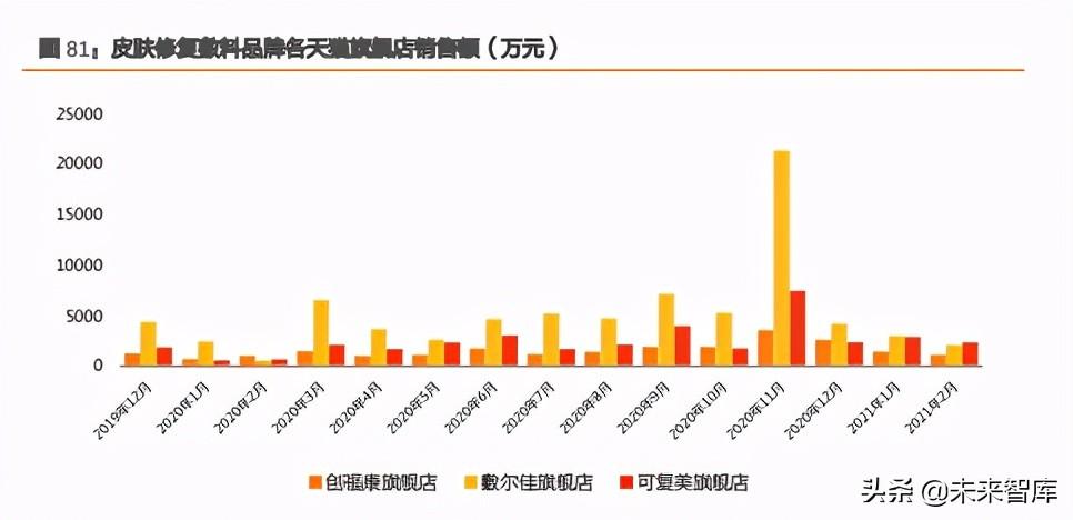 敷爾佳銷售額領先,創(chuàng)福康、可復美銷售穩(wěn)定。從各皮膚修復敷料品牌天貓旗艦店銷售額 來看,敷爾佳旗艦店銷售額穩(wěn)定領先,創(chuàng)??蹬c可復美旗艦店銷售額相差不大,但總體趨 勢上可復美旗艦店銷售額略大于創(chuàng)??灯炫灥辍?1 月受雙十一大促銷影響均有大幅同比增 長。從近半年各皮膚修復敷料品牌天貓旗艦店 TOP2 熱銷單品來看,創(chuàng)??灯炫灥赇N量穩(wěn) 定領先,敷爾佳旗艦店次之。各品牌熱銷單品名稱中多含“醫(yī)美”、“醫(yī)用”、“術后修復”、 “抗敏感”等關鍵詞,體現消費人群對敏感肌修護以及醫(yī)美修復的高度關注。