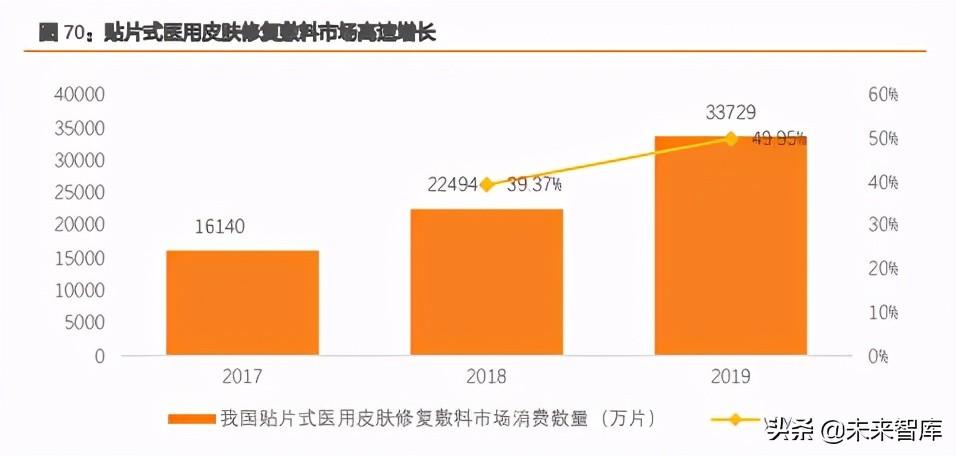 貼片式醫(yī)用皮膚修復敷料市場高增。隨著大眾尤其是新一代消費者對美的關注和投入增多, 以及“醫(yī)美面膜”概念快速傳播,我國貼片式醫(yī)用皮膚修復敷料市場快速成長,近三年 CAGR 超過 40%,2019 年消費量達到 3.4 億片,銷售額超過 50 億元,滲透率約 30%。