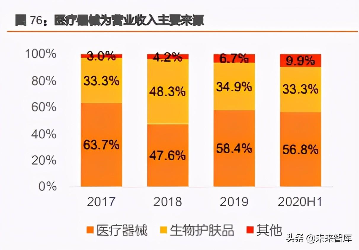 醫(yī)療器械為創(chuàng)爾生物主要營收來源。創(chuàng)爾主營業(yè)務收入可按醫(yī)療器械和生物護膚品分類, 其中醫(yī)療器械為主要收入來源,占主營業(yè)務收入比例基本保持在 50%以上,2019 年同比增 速 73.4%,在高基數基礎上仍取得較快增長;生物護膚品占主營業(yè)務收入比例基本保持在 30%以上,2019 年增速放緩。