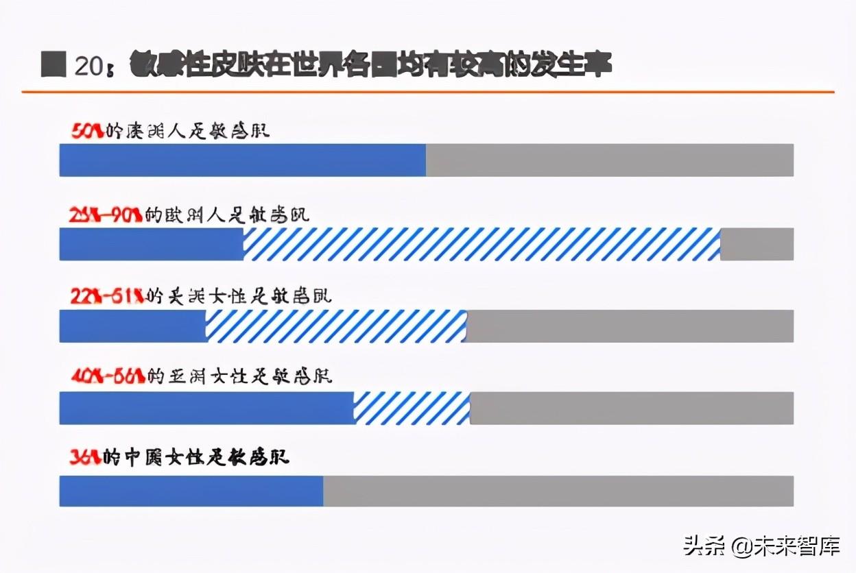 多因素引發(fā)各國敏感肌發(fā)生率較高,疫情期間戴口罩加重皮膚問題。由于調查方法不 同,各地報道的發(fā)生率差異較大,歐洲為 25.4%~89.9%,澳洲為 50%;女性普遍高于男性, 美洲女性為 22.3%~50.9%,亞洲女性為 40%~55.98%,其中我國女性為 36.1%。受環(huán)境、氣 候、壓力、刺激性食物等多因素影響,我國敏感肌發(fā)生率居高,整體而言,超過七成的敏 感肌女性其肌膚敏感程度處于弱度或輕度,通過日常保養(yǎng)護膚就可以對敏感肌進行改良, 另一方面有近三成的敏感肌女性肌膚問題較為嚴重,已出現紅腫/發(fā)炎等敏感表現。自疫情 爆發(fā)以來,佩戴口罩已經成為大眾的習慣,超六成消費者佩戴口罩后發(fā)現皮膚過敏、致痘、 毛孔粗大等癥狀,其中女性受困擾比例更高。