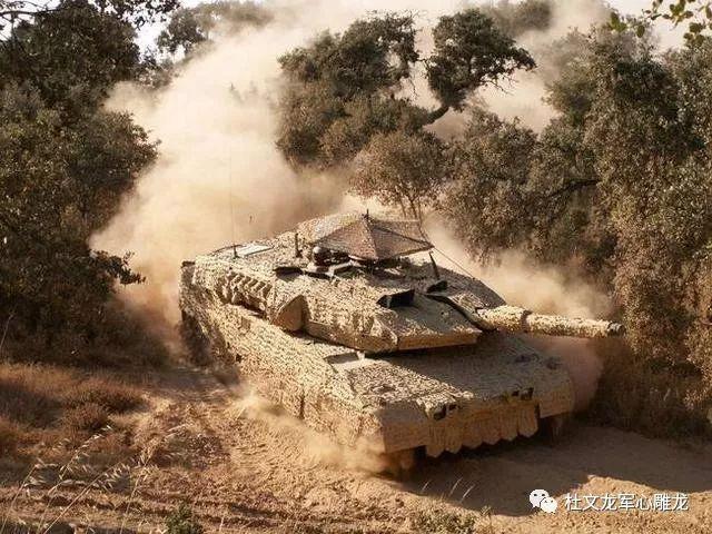 安裝了“戰(zhàn)術(shù)遮陽(yáng)傘”和“梭魚”披掛式紅外偽裝系統(tǒng)的豹2A6M