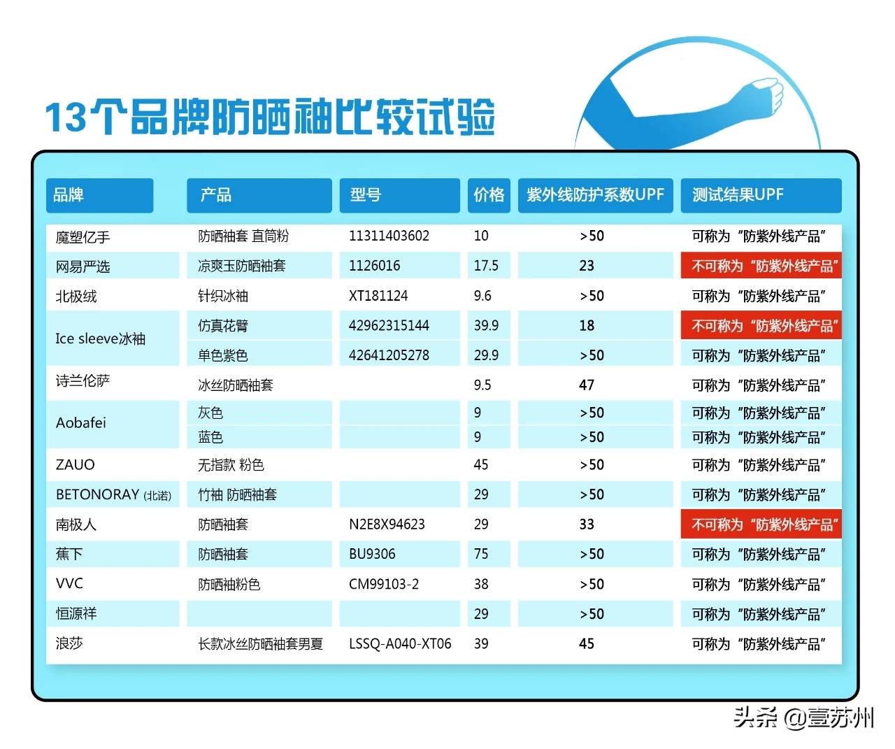 根據(jù)檢測結果顯示,魔塑億手、北極絨、蕉下、恒源祥、浪莎等10款產品,UPF(即紫外線防護系數(shù))大于40,且UVA(長波紫外線)透過率小于5%,可稱為“防紫外線產品”。