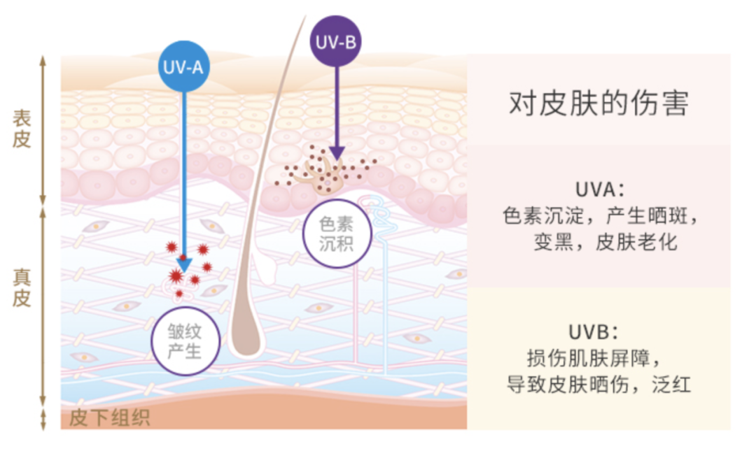 UVA能直達(dá)皮膚的層,長期照射會破壞皮膚的彈性纖維和膠原蛋白纖維,是導(dǎo)致皮膚老化、變黑、產(chǎn)生色斑的元兇。