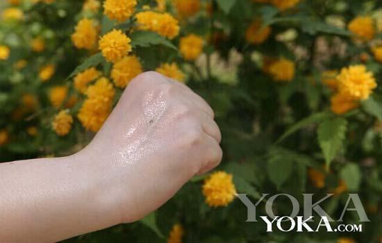 編輯在拍攝前在手背上寫了嬌韻詩的英文字母,之后把防曬乳擠在手背上,哇哦,流動性很強,看樣子就很清透不油膩,夏天選防曬產(chǎn)品就是要輕、薄、透。