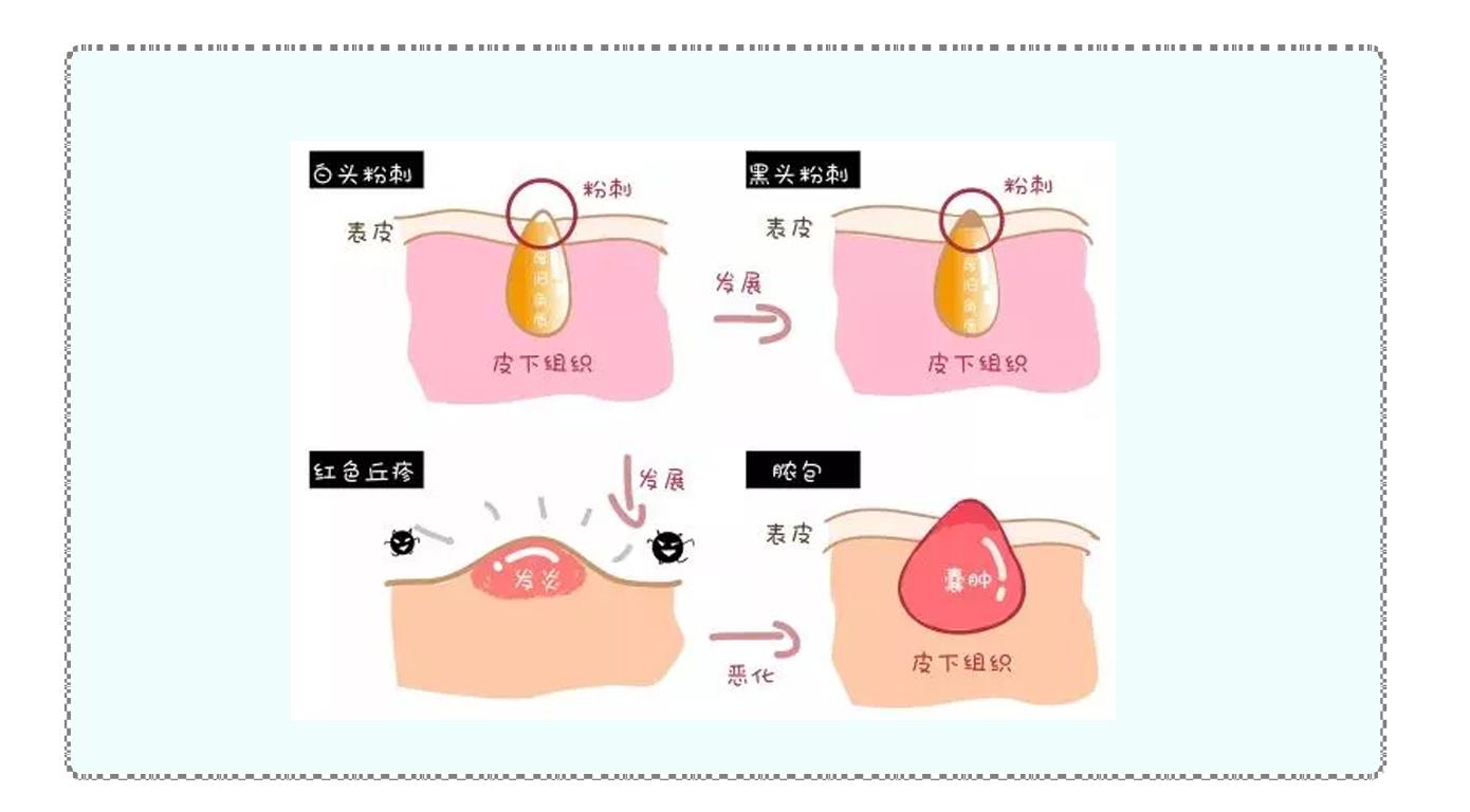常見(jiàn)的痤瘡是黑、白頭粉刺和發(fā)紅的小膿包,大多發(fā)生在皮脂腺分泌比較旺盛的地方,比如后背、下巴、發(fā)際線和胸口等處,嚴(yán)重的會(huì)感覺(jué)到一丟丟疼痛。