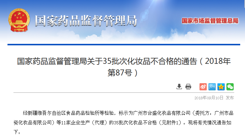 2018年9月10日,藥品監(jiān)督管理局通告稱,經(jīng)新疆維吾爾自治區(qū)食品藥品檢驗所等檢驗,資生堂(中國)投資有限公司代理的日本安熱沙防曬露N SPF30+PA +++不合格。